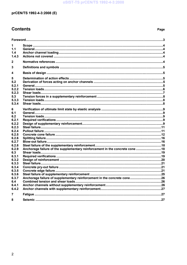 1.1 General 1.1.6 This document relies on characteristic resistances and distances which are stated in a European Technical Specification. In minimum the following characteristics should be given in a European Technical Specification as base for the design methods of this CEN/TS. - (...) - NRk,p - (...) - ccr,N, scr,N - ccr,sp, scr,sp - cmin, smin, hmin - limitations on concrete strength classes of base material - k5 - Ah, bch, d, hef, hch, Iy - yMi partial factors for material see also CEN/TS 1992-4-1:2009, clause 4 1.4 Anchor channel loading 1.4.3 Actions not covered The following actions are not covered by this CEN/TC: - shear in the direction of the longitudinal axis of the channel; - fatigue loading; - seismic loading.