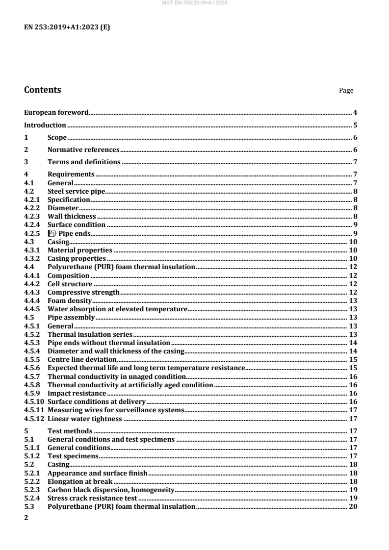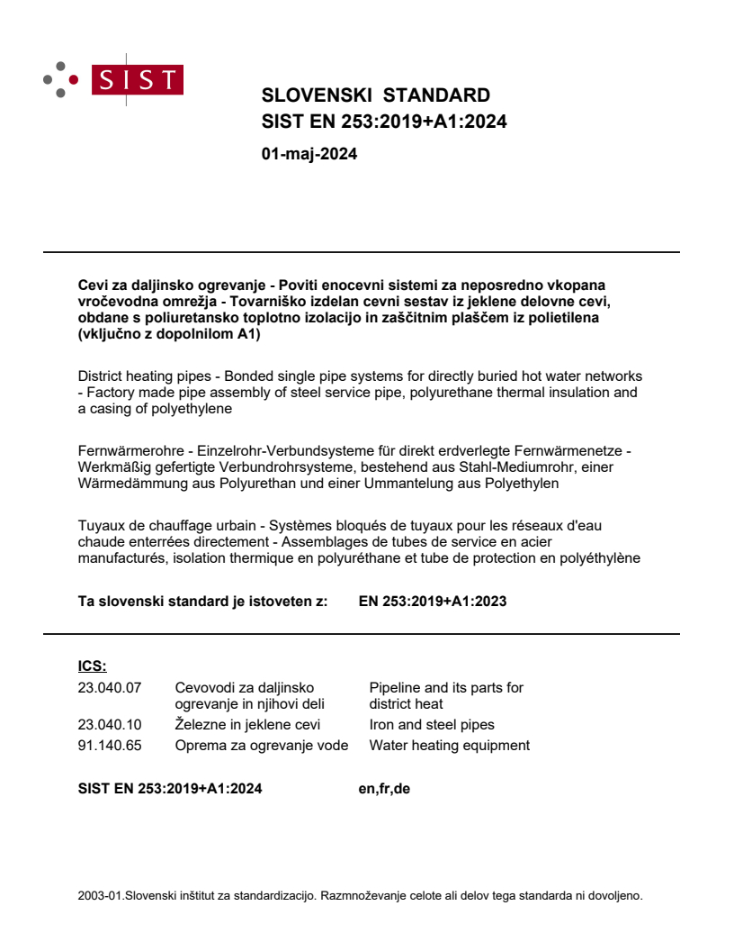 EN 253:2019+A1:2023 is a standard published by the European Committee for Standardization (CEN). Its full title is "District heating pipes - Bonded single pipe systems for directly buried hot water networks - Factory made pipe assembly of steel service pipe, polyurethane thermal insulation and a casing of polyethylene". This standard covers: This document specifies requirements and test methods for straight lengths of factory made thermally insulated bonded single pipe assemblies for hot water networks in accordance with EN 13941-1, comprising a steel service pipe, polyurethane foam thermal insulation and a casing of polyethylene. The pipe assembly can also include the following additional elements: measuring wires, spacers and diffusion barriers.