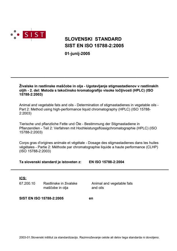 Živalske in rastlinske maščobe in olja - Ugotavljanje stigmastadienov v rastlinskih oljih - 2. del: Metoda s tekočinsko kromatografijo visoke ločljivosti (HPLC) (ISO 15788-2:2003)