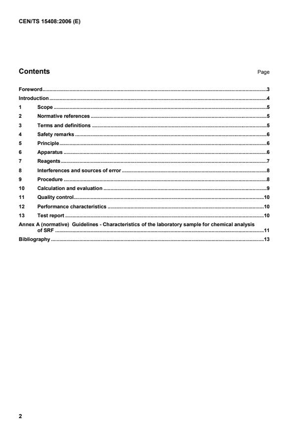 CEN/TS 15408:2006 is a technical specification published by the European Committee for Standardization (CEN). Its full title is "Solid recovered fuels - Methods for the determination of sulphur (S), chlorine (Cl), fluorine (F) and bromine (Br) content". This standard covers: This Technical Specification describes the determination of S, Cl, F and Br in solid recovered fuels of various origin and composition after combustion in oxygen atmosphere. S and Cl can be alternatively determined by direct automatic analysis (see Bibliography for examples of available methods). Other methods could also be used provided that it is demonstrated that they give the same results. This method is applicable for concentrations over 0,025 g/kg, depending on the element and on the determination technique. Insoluble halides and sulphate present in the original sample or produced during the combustion step are not completely determined by these methods. This Technical Specification provides recommendations concerning standardised methods for determination of halides and sulphate in the solution obtained after combustion.