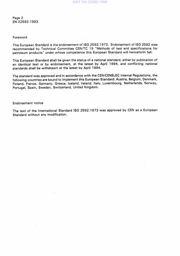FOREWORD IS0 (the International Organization for Standardization) is a worldwide federation of national standards institutes (IS0 Member Bodies). The work of developing International Standards is carried out through IS0 Technical Committees. Every Member Body interested in a subject for which a Technical Committee has been set up has the right to be represented on that Committee. International organizations, governmental and non-governmental, in liaison with ISO, also take part in the work. Draft International Standards adopted by the Technical Committees are circulated to the Member Bodies for approval before their acceptance as International Standards by the IS0 Council. International Standard IS0 2592 was drawn up by Technical Committee ISO/TC 28, Petroleum products, and circulated to the Member Bodies in July 1972. It has been approved by the Member Bodies of the following countries : Th e Member Body o on technical grounds Belgium Brazil Canada Chile Czechoslovakia Egypt, Arab Rep. of Germany Hungary India Iran Ireland Israel Mexico Netherlands New Zealand Norway Poland Portugal #f the following country expr tessed disapproval of the document France Romania South Africa, Rep, of Spain Sweden Thailand Turkey United Kingdom U.S.A. U.S.S.R. 0 International Organization for Standardization, 1973 l Printed in Switzerland SIST EN 22592:1998