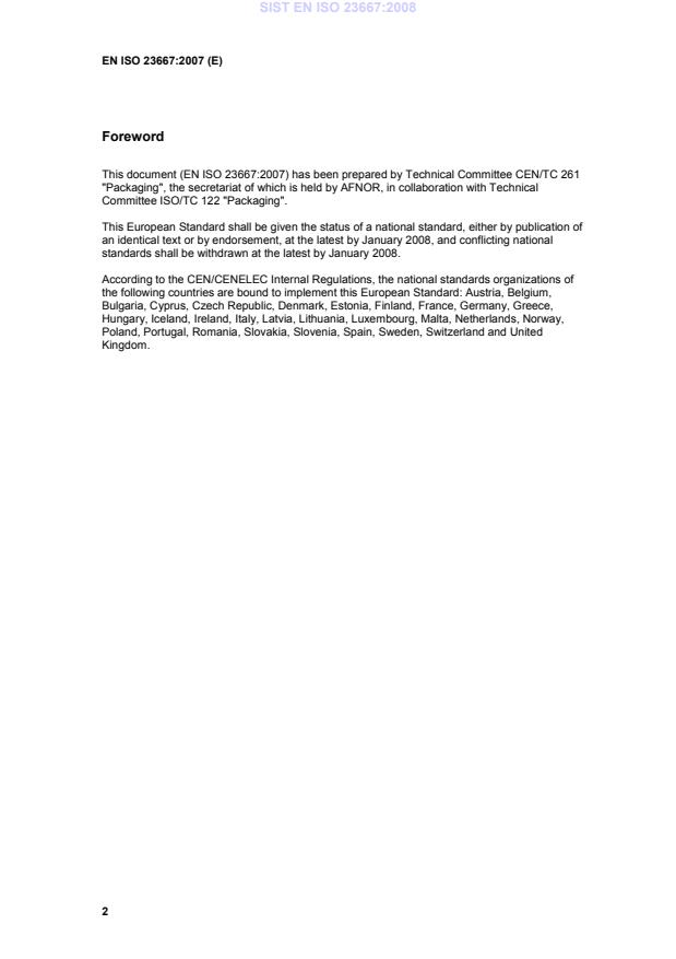 EN ISO 23667:2007 is a standard published by the European Committee for Standardization (CEN). Its full title is "Packaging - Transport packaging for dangerous goods - Rigid plastics and plastics composite IBCs - Compatibility testing (ISO 23667:2007)". This standard covers: ISO 23667:2006 specifies the requirements and test methods for compatibility testing of polyethylene-based plastics Intermediate Bulk Containers (IBCs) and composite IBCs with plastics inners containing liquids. The testing involves storage with the packaged substance, or with a standard liquid as defined in Annex A. Annex B describes small scale laboratory tests, which may be used to determine the assimilation of those products to be carried with the standard liquids.