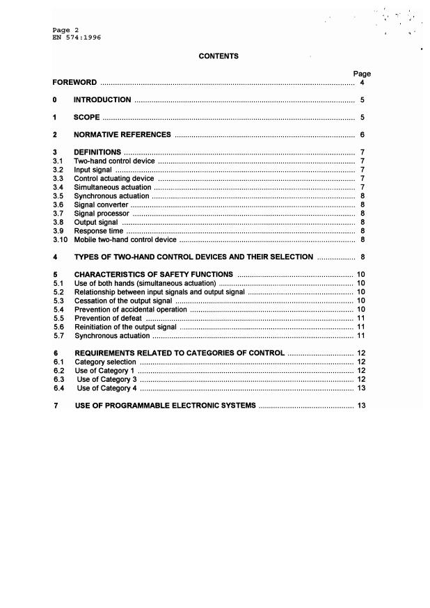 EN 574:1996 is a standard published by the European Committee for Standardization (CEN). Its full title is "Safety of machinery - Two-hand control devices - Functional aspects - Principles for design". This standard covers: This standard specifies the safety requirements of a two-hand control device and its logic unit as defined in 3.1. This standard describes the main characteristics of two-hand control devices for the achievement of safety and sets out combinations of functional characteristics for three types. This standard does not apply to devices intended to be used as enabling devices, hold to run devices and as special control devices. This standard does not specify with which machines two-hand control devices shall be used. It also does not specify which types of two-hand-control device shall be used. Moreover it does not specify the distance between the two-hand control device and the danger zone (see 9.8). The standard provides requirements and guidance on the design and selection (based on a risk assessment) of two-hand control devices including their assessment, the prevention of defeat and the avoidance of faults. The standard also provides requirements and guidance for two-hand control devices containing a programmable electronic system (see 7). This standard applies to all two-hand control devices, independent of the energy used, including: - two-hand control devices which are or are not integral parts of a machine. - two-hand control devices which consist of one or more than one separate elements.