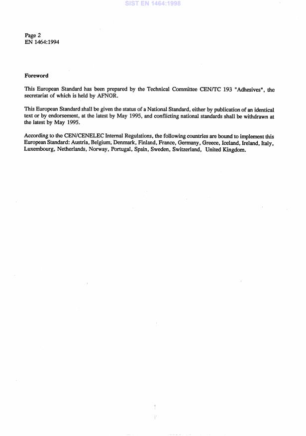 EN 1464:1994 is a standard published by the European Committee for Standardization (CEN). Its full title is "Adhesives - Determination of peel resistance of high-strength adhesive bonds - Floating roller method (ISO 4578:1990 modified)". This standard covers: This European Standard specifies a floating roller method for the determination of the peel resistance of high-strength adhesive bonds between one rigid adherend and one flexible adherend when tested under specified conditions of preparation and testing.