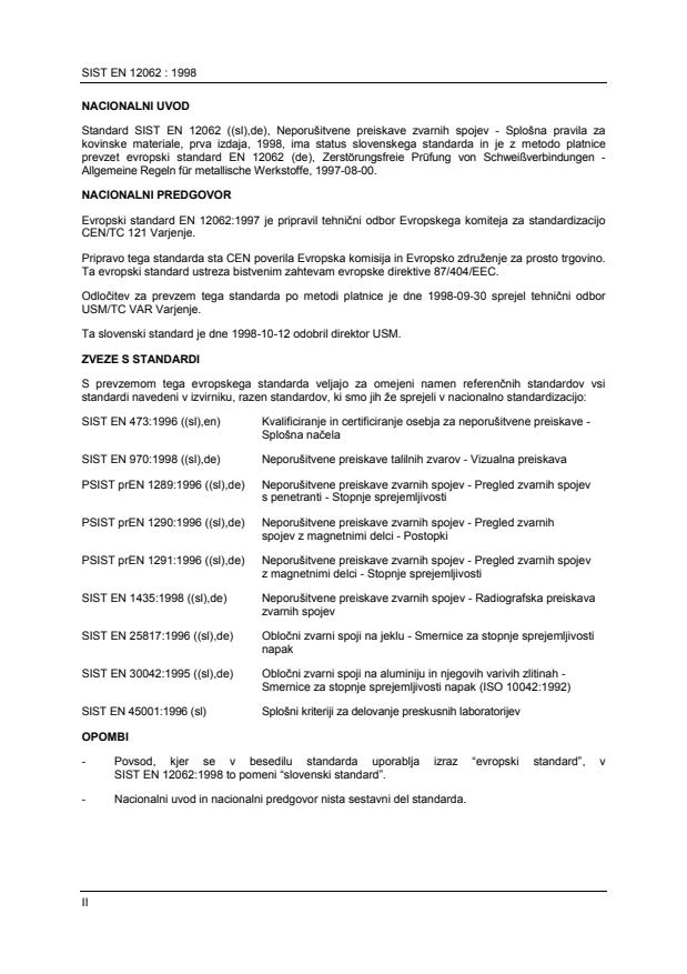 EN 12062:1997 is a standard + national annex and/or foreword published by the European Committee for Standardization (CEN). Its full title is "Non-destructive examination of welds - General rules for metallic materials". This standard covers: Based on quality requirements, material, weld thickness, welding process and extent of examination, this standard gives guidance for the choice of non-destructive examination methods of welds and evaluation of the results for quality control purposes. This standard also specifies general rules and standards to be applied to the different types of examination, for either the methodology or the acceptance level for metallic materials. Acceptance levels cannot be a direct interpretation of the quality levels defined in EN 25817 or EN 30042. They are linked to the overall quality of the produced batch of welds. Requirements for acceptance levels for non-destructive examination comply with quality levels stated in EN 25817 or EN 30042 (moderate, indermediate, stringent), only on a general basis and not in detail for each indication. This standard can be used by application standards or by agreement between the contracting parties.