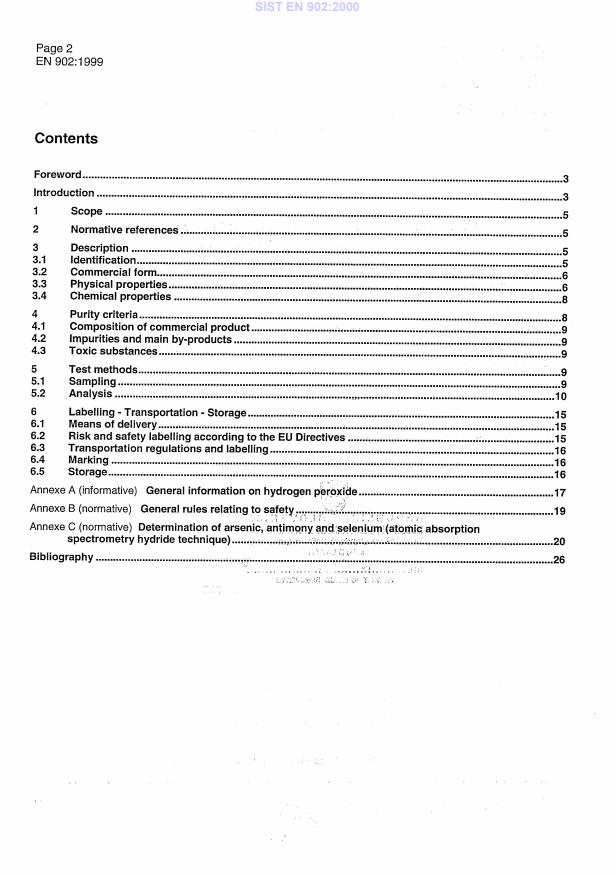 EN 902:1999 is a standard published by the European Committee for Standardization (CEN). Its full title is "Chemicals used for treatment of water intended for human consumption - Hydrogen peroxide". This standard covers: This European Standard is applicable to hydrogen peroxide used for treatment of water intended for human consumption. It describes the characteristics of hydrogen peroxide and specifies the requirements and the corresponding test methods for hydrogen peroxide. It gives information on its use in water treatment.