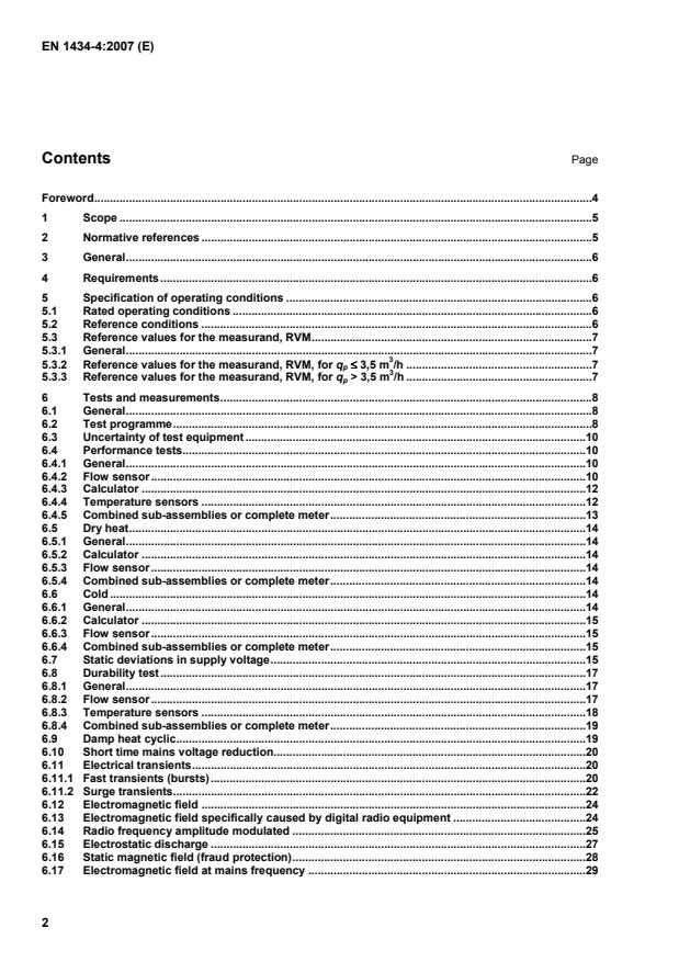 The power and signal wires shall be connected. The flow sensor including flow sensor electronics shall be operated at zero flow rate (without low flow cut off device). 6 Tests and measurements 6.1 General Unless otherwise stated in the test specification, the test requirements apply irrespective of the heat meter's environmental class. See Clause 10 of EN 1434-1:2007. All measurements shall be carried out under the installation conditions stipulated by the supplier for his type of meter (e.g. straight sections of piping upstream and downstream of the meter). For all tests the heat conveying liquid shall be water, unless otherwise specified. If so, the performance test shall be carried out with the specified liquid and the type approval certificate shall include the specification of the liquid to be used for initial verification. If a temperature sensor can be installed in the flow sensor, this shall be done during the performance tests of the flow sensor. Where a filter or strainer is an integral part of the flow sensor, it shall be included in all the tests. If the error determined lies outside the MPE, the test shall be repeated twice unless otherwise stated. The test is then declared satisfactory if both the arithmetic mean of the result of the three tests and at least two of the test results are within or at the MPE. Depending on the flow sensor size the tests and measurements to be carried out are described below: For each meter model the test in 6.4, 6.18 and 6.19 can be carried out on a limited number of sizes according to an evaluation by the testing laboratory. This evaluation shall be included in the type testing report. The test in 6.8 shall be carried out only for those sizes of a type for which the highest wear is expected. For dimensions > DN 200, 6.19 shall be carried out at Θmin. For each meter model the following tests shall be carried out on one size only: 6.5, 6.6, 6.7, 6.9, 6.10, 6.11, 6.12, 6.13, 6.14, 6.15, 6.16, 6.17, 6.20 and 6.21. 6.2 Test programme Samples of a heat meter, or its sub-assemblies, submitted for pattern approval, shall be subject to tests to verify their conformity with Clause 4. Unless otherwise stated, the tests shall be carried out at reference con-ditions and the samples shall be exposed to the influence factors or disturbances specified for the respective tests, as stated in Table 3. The test sequence and the number of items used shall be either as described in Table 2 or as agreed between the supplier and the testing laboratory (assuming four samples, numbered by the testing laboratory). Only one influence quantity shall be applied at a time. If the meter under test (complete, combined or sub-assemblies) has test outputs for quantity of water, temperature difference and/or energy, these outputs can be used to test such parameters.