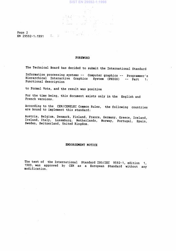 EN 29592-1:1991 is a standard published by the European Committee for Standardization (CEN). Its full title is "Information processing systems - Computer graphics - Programmer's Hierarchical Interactive Graphics Systems (PHIGS) - Part 1: Functional description (ISO/IEC 9592-1:1989, ed. 1)". This standard covers: Information processing systems - Computer graphics - Programmer's Hierarchical Interactive Graphics Systems (PHIGS) - Part 1: Functional description (ISO/IEC 9592-1:1989, ed. 1)