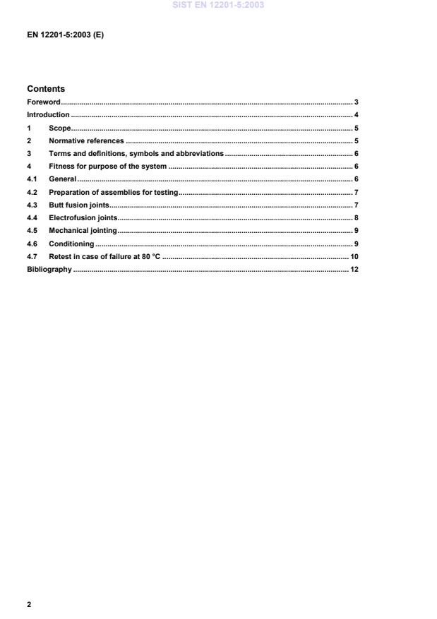 it should be noted that, while awaiting the adoption of verifiable European criteria, existing national regulationsconcerning the use and/or the characteristics of this product remain in force.Requirements and test methods for components of the piping system are specified in EN 12201-1, EN 12201-2[1],EN 12201-3[2] and EN 12201-4[3]. PrCEN/TS 12201-7[4] gives guidance for the assessment of conformity.This Part of this European Standard covers the characteristics of the fitness for purpose of the system.SIST EN 12201-5:2003