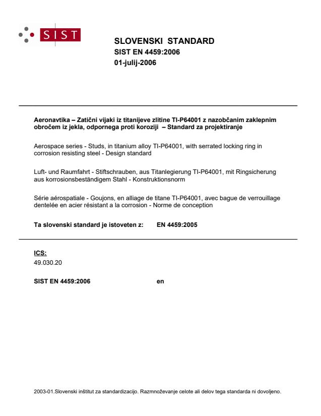 2003-01.Slovenski inštitut za standardizacijo. Razmnoževanje celote ali delov tega standarda ni dovoljeno.Aerospace series - Studs, in titanium alloy TI-P64001, with serrated locking ring in corrosion resisting steel - Design standardLUDQMHSérie aérospatiale - Goujons, en alliage de titane TI-P64001, avec bague de verrouillage dentelée en acier résistant a la corrosion - Norme de conceptionLuft- und Raumfahrt - Stiftschrauben, aus Titanlegierung TI-P64001, mit Ringsicherung aus korrosionsbeständigem Stahl - KonstruktionsnormTa slovenski standard je istoveten z:EN 4459:2005SIST EN 4459:2006en49.030.20ICS:SLOVENSKI