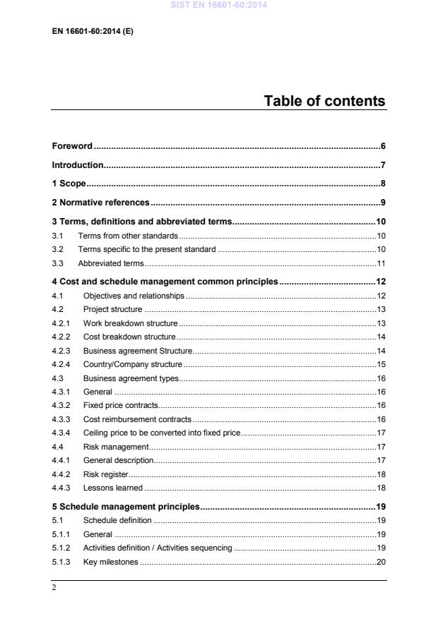 and MPP Cost estimates (EAC and ETC) Task definition, duration and sequencing Schedule management Schedule report (progress status, performances, delivery and trends) Project milestones CBS and CCS (+geo return) Inventory control plan Audit Geographical distribution CCN Financial elements (Company cost element data sheet, Company price breakdown forms, Manpower and price summary, Work package manpower and cost plan, Price variation mechanism) Report (Performance measurement, Contract close out report, payment and commitment status report, Inventory record) SIST EN 16601-60:2014