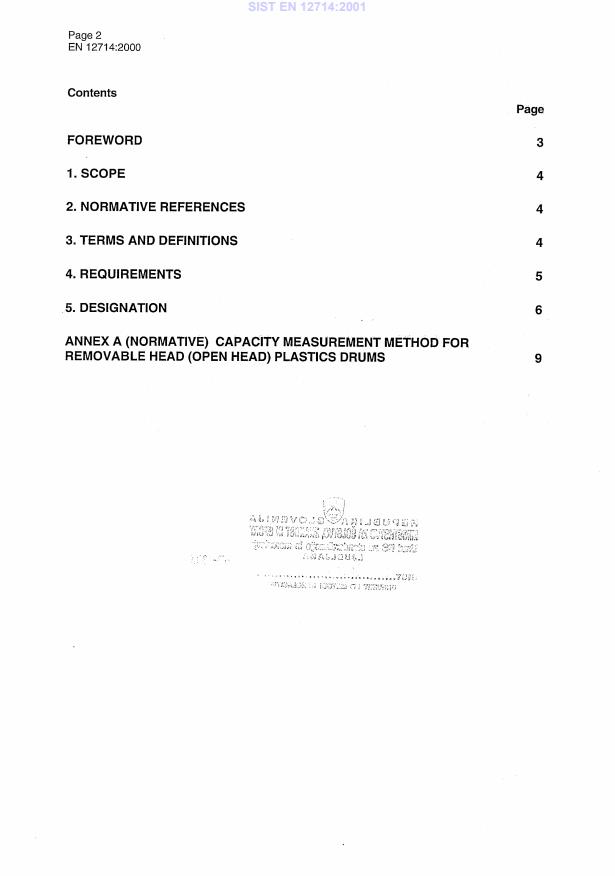 EN 12714:2000 is a standard published by the European Committee for Standardization (CEN). Its full title is "Plastics drums - Removable head (open head) drums with a nominal capacity of 25 l to 220 l". This standard covers: This European Standard specifies the characteristics and dimensions of removable head (open head) plastics drums with a nominal capacity of 25 litres to 220 litres. This standard is not applicable to injection moulded pails.