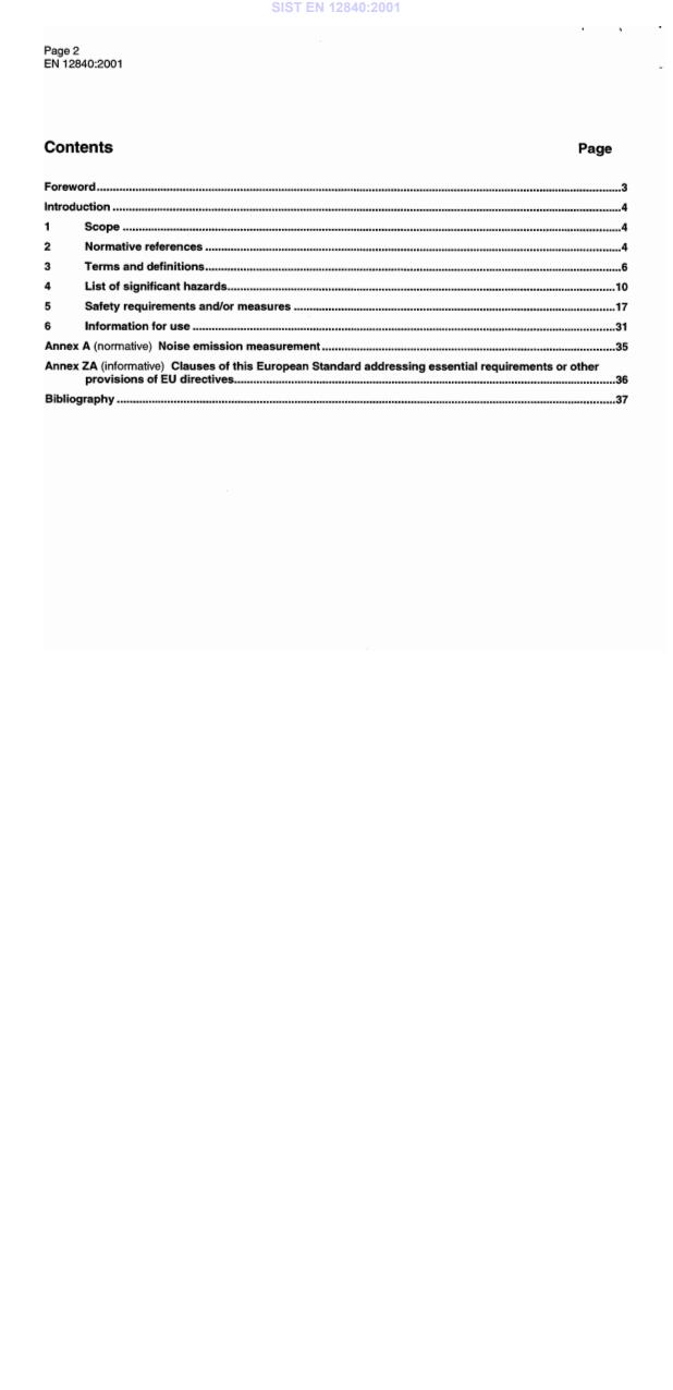 EN 12840:2001 is associated with the following European legislation: EU Directives/Regulations: 98/37/EC; Standardization Mandates: M/BC/CEN/88/13. When a standard is cited in the Official Journal of the European Union, products manufactured in conformity with it benefit from a presumption of conformity with the essential requirements of the corresponding EU directive or regulation.