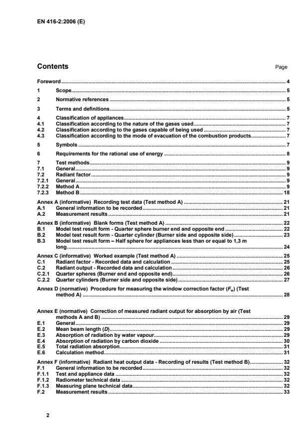 Page Foreword.4 1 Scope.5 2 Normative references.5 3 Terms and definitions.5 4 Classification of appliances.7 4.1 Classification according to the nature of the gases used.7 4.2 Classification according to the gases capable of being used.7 4.3 Classification according to the mode of evacuation of the combustion products.7 5 Symbols.7 6 Requirements for the rational use of energy.8 7 Test methods.9 7.1 General.9 7.2 Radiant factor.9 7.2.1 General.9 7.2.2 Method A.9 7.2.3 Method B.18 Annex A (informative)