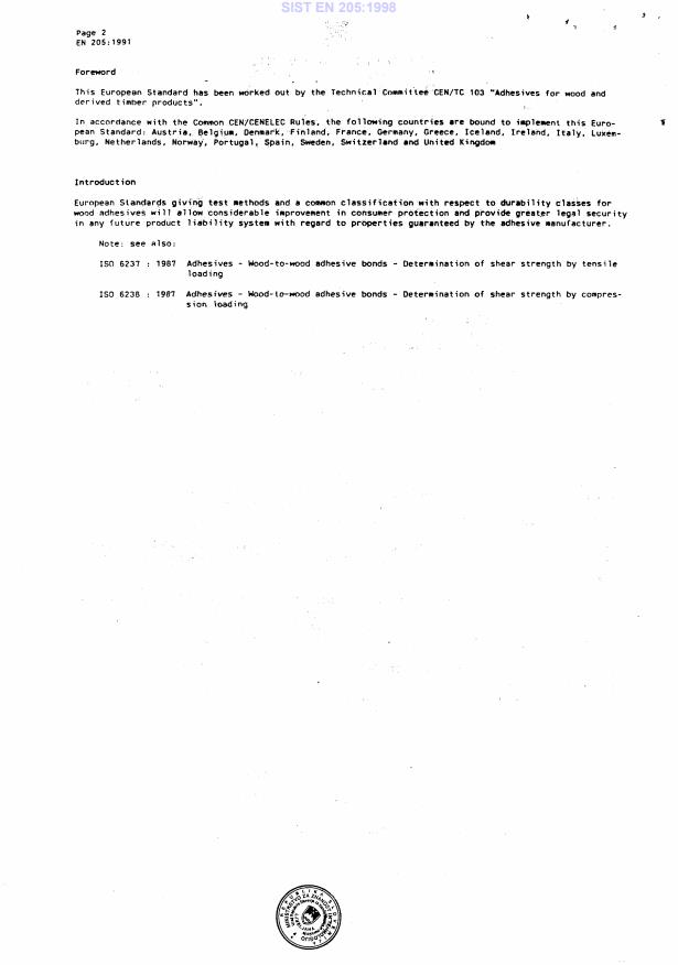 EN 205:1991 is a standard published by the European Committee for Standardization (CEN). Its full title is "Test methods for wood adhesives for non-structural applications - Determination of tensile shear strength of lap joints". This standard covers: This standard contains tests for adhesives for wood and derived timber products for the assessment of their resistance to various purely physical effects. It does not apply to adhesives for structural use nor to the manufacture of particle boards, fibre boards, and plywood. It does not replace specific tests or tests on finished products.