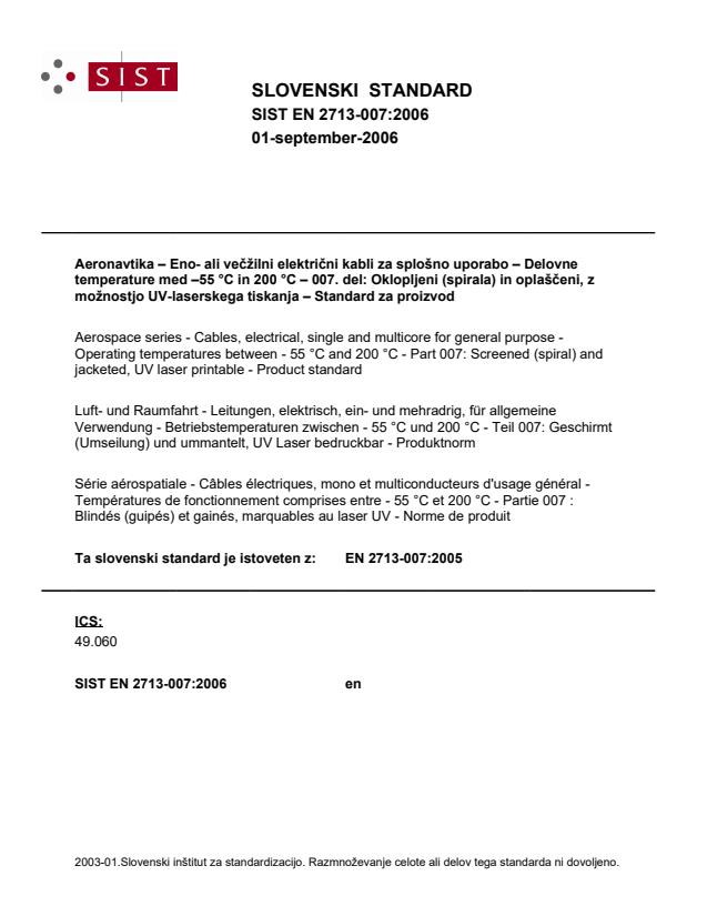 EN 2713-007:2005 is a standard published by the European Committee for Standardization (CEN). Its full title is "Aerospace series - Cables, electrical, single and multicore for general purpose - Operating temperatures between - 55 °C and 200 °C - Part 007: Screened (spiral) and jacketed, UV laser printable - Product standard". This standard covers: This standard specifies the characteristics of UV laser printable, single and multicore screened (spiral) and jacketed electrical cables for use in the on-board electrical systems of aircraft, at operating temperatures between - 55 °C and 200 °C. It shall also be possible to mark these cables by hot stamp printing or ink jet printing. These markings shall be in accordance with EN 3838.