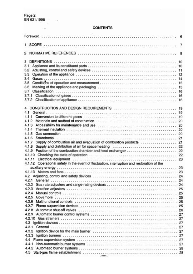 EN 621:1998 is a standard published by the European Committee for Standardization (CEN). Its full title is "Non-domestic gas-fired forced convection air heaters for space heating not exceeding a net heat input of 300 kW, without a fan to assist transportation of combustion air and/or combustion products". This standard covers: This European Standard specifies the requirements and test methods for the safety and efficiency of non-domestic gas-fired air heaters not exceeding a net heat input of 300 kW with (an) atmospheric burner(s) and without a fan to assist the transportation of combustion air and/or flue gases, hereafter referred to as "appliances". This European Standard applies to Type B11, C11 and C31 appliances intended for use in other than single unit residential dwellings. Provision of the heated air may be by means of ducting or may be directly into the heated space. This standard does not apply to: ð appliances intended for use in a single unit residential dwelling; ð appliances of the condensing type; ð appliances for outdoor installation; ð dual purpose air conditioning appliances (heating and cooling); ð appliances where the air is heated by an intermediate fluid; ð appliances with forced draught burners; ð appliances fitted with a manual or automatic means of adjusting the combustion air supply or the combustion products evacuation (including flue dampers); ð portable or transportable forced convection appliances; ð appliances having multiple heating units with a single draught diverter; ð appliances fitted with more than one flue outlet. This European Standard is applicable to appliances which are intended to be type tested. NOTE: Requirements for appliances which are not type tested would need to be subject to further consideration.