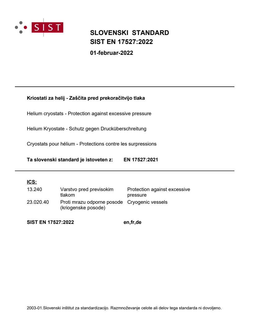 Keywords: EN 17527:2021, helium cryostats, protection against excessive pressure, pressure relief devices, cryogenic safety, quench, loss of vacuum, PRV, bursting disc.