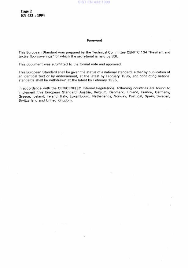 EN 433:1994 is a standard published by the European Committee for Standardization (CEN). Its full title is "Resilient floor coverings - Determination of residual indentation after static loading". This standard covers: This European Standard specifies a method for determining the residual indentation produced in a resilient floorcovering after the application and removal of a constant load.