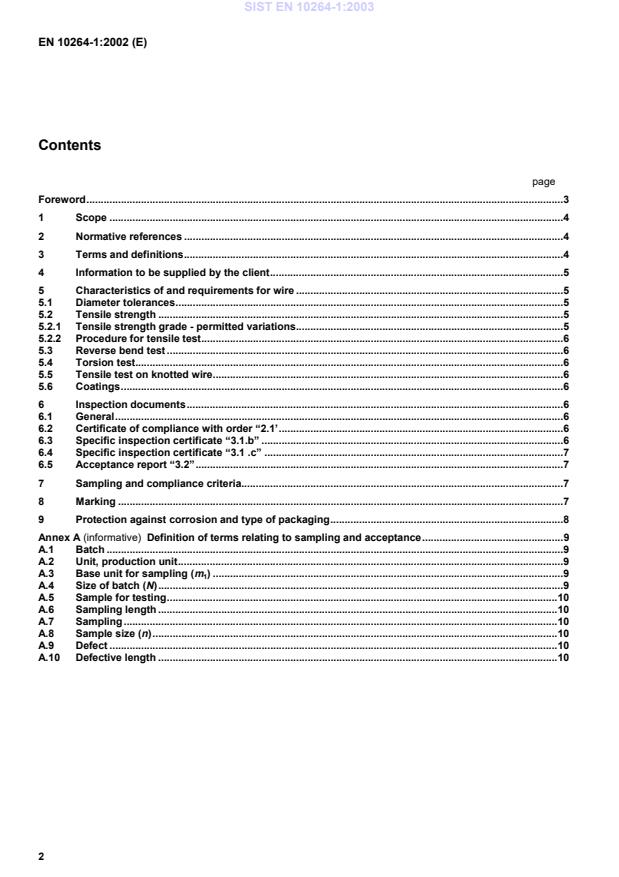 Definition of terms relating to sampling and acceptance.9A.1Batch.9A.2Unit, production unit.9A.3Base unit for sampling (m1).9A.4Size of batch (N).9A.5Sample for testing.10A.6Sampling length.10A.7Sampling.10A.8Sample size (n).10A.9Defect.10A.10Defective length.10SIST EN 10264-1:2003