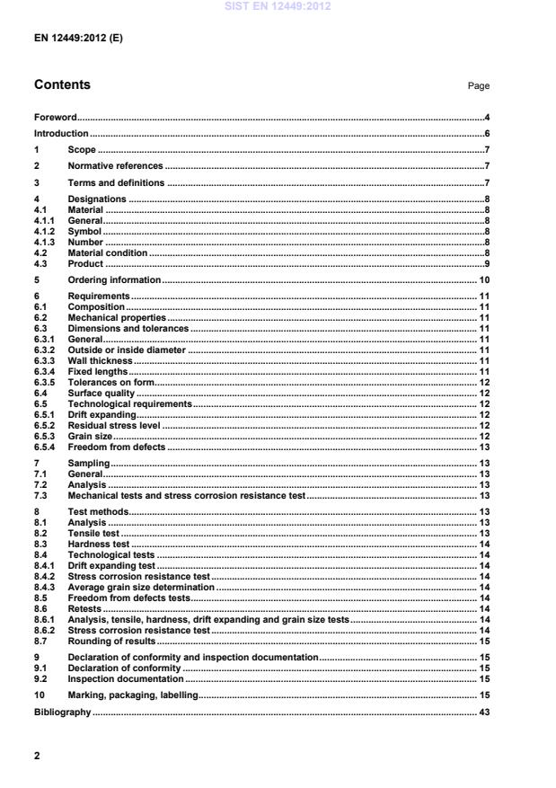 — fixed length 3 000 mm 6 Requirements 6.1 Composition The composition shall conform to the requirements for the appropriate material given in Tables 1 to 8. 6.2 Mechanical properties The properties shall conform to the appropriate requirements given in Tables 9 to 15. The tests shall be carried out in accordance with either 8.2 (tensile test) or 8.3 (hardness test). Products in stress relieved condition shall conform to the same mechanical property requirements as for non stress relieved material. 6.3 Dimensions and tolerances 6.3.1 General The geometrical properties of the tubes are defined by outside diameter or inside diameter, wall thickness and length. Normally, tolerances for cross-sectional dimensions are applied on the outside diameter (see 6.3.2) and wall thickness (see 6.3.3) but other possibilities may be agreed between the purchaser and the supplier at the time of the enquiry and order [see Clause 5, list entry j)]. Normally, tubes are supplied in lengths with tolerances agreed between the purchaser and the supplier at the time of the enquiry and order [see Clause 5, list entry g)] but tubes may be ordered as "fixed lengths" (see 6.3.4). 6.3.2 Outside or inside diameter The diameter of the tubes shall conform to the tolerances given in Table 16. 6.3.3 Wall thickness The wall thickness, measured at any point, shall conform to the tolerances given in Table 17. 6.3.4 Fixed lengths Tubes in straight lengths ordered as "fixed lengths" shall conform to the tolerances given in Table 18. Tubes in coiled form ordered as "fixed lengths" shall conform to the tolerances given in Table 19. SIST EN 12449:2012