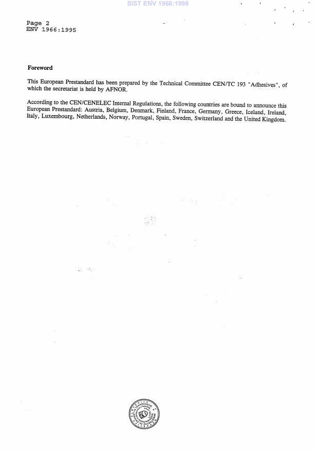 ENV 1966:1995 is a standardization document published by the European Committee for Standardization (CEN). Its full title is "Structural adhesives - Characterization of a surface by measuring adhesion by means of the three point bending method". This standard covers: Migrated from Progress Sheet (TC Comment) (2000-07-10): ENV: REAL40 = 1993-06; REAL53 = 1995-07 ++ ENV into EN by a FV, without further updating (TC Res 207-BL 991006)