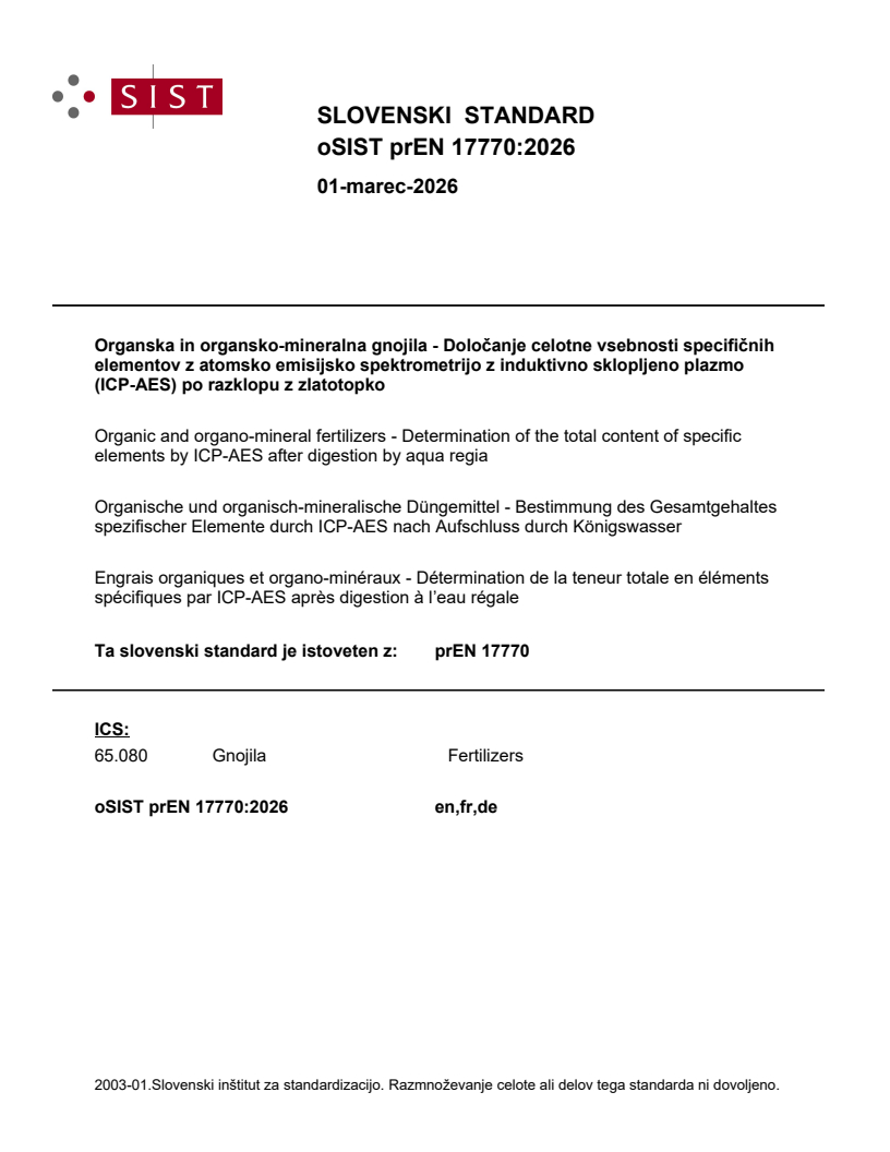 prEN 17770 is a draft published by the European Committee for Standardization (CEN). Its full title is "Organic and organo-mineral fertilizers - Determination of the total content of specific elements by ICP-AES after digestion by aqua regia". This standard covers: This document specifies a method for the determination of arsenic (As), cadmium (Cd), copper (Cu), chromium (Cr), lead (Pb), nickel (Ni)), boron (B), cobalt (Co), iron (Fe), manganese (Mn), molybdenum (Mo), zinc (Zn), phosphorus (P), potassium (K), magnesium (Mg), calcium (Ca), sulfur (S) and sodium (Na) in aqua regia digests of organic, organo-mineral fertilizers, and their fertilizing product blends using inductively coupled plasma-atomic emission spectrometry (ICP-AES). It is applicable and validated for several types of matrices as indicated in Annex A. This document is applicable to the component materials “by-products”, when used as components of fertilizing products, as well as the fertilizing products blends where a blend is a mix of at least two of the following components: fertilizers, liming materials, soil improvers, growing media, inhibitors, plant biostimulants, and where the following category: organic fertilizers, organo-mineral fertilizers is the highest % in the blend by mass or volume, or in the case of liquid form by dry mass. If the organic fertilizer or the organo-mineral fertilizer is not the highest % in the blend, the European Standard for the highest % of the blend applies. In case a fertilizing product blend is composed of components in equal quantity, the user decides which standard to apply. Variations in analytical methods for fertilizing product blends can lead to differing results as some components or matrix interactions can affect the outcome. Validation procedures have shown that developed standard methods are robust and reliable across diverse product compositions, but possible interferences and unexpected results when analysing fertilizing product blends are possible. This method is applicable to aqua regia digests prepared according to prEN 17768. NOTE Alternatively, inductively coupled plasma mass spectrometry (ICP-MS) can be used for the determination of the elements in the aqua regia digests if the user proves that the method gives the same results.