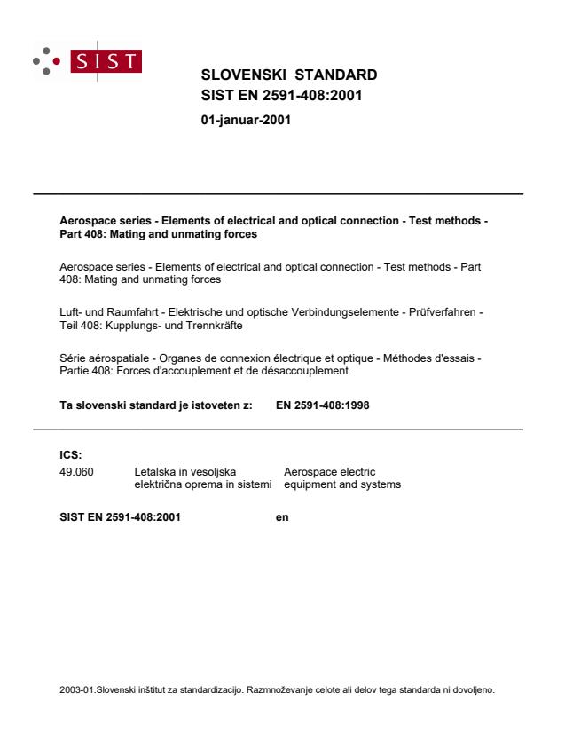 2003-01.Slovenski inštitut za standardizacijo. Razmnoževanje celote ali delov tega standarda ni dovoljeno.Aerospace series - Elements of electrical and optical connection - Test methods - Part 408: Mating and unmating forcesLuft- und Raumfahrt - Elektrische und optische Verbindungselemente - Prüfverfahren - Teil 408: Kupplungs- und TrennkräfteSérie aérospatiale - Organes de connexion électrique et optique - Méthodes d'essais - Partie 40
