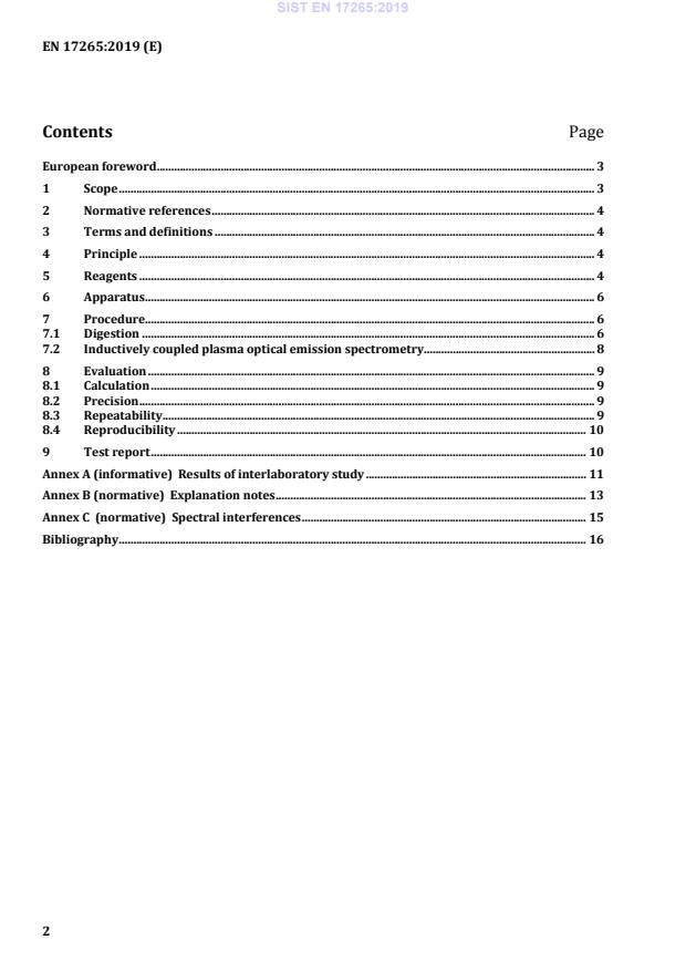 EN 17265:2019 is a standard published by the European Committee for Standardization (CEN). Its full title is "Foodstuffs - Determination of elements and their chemical species - Determination of aluminium by inductively coupled plasma optical emission spectometry (ICP-OES)". This standard covers: This document specifies a method for the determination of aluminium in food by inductively coupled plasma optical emission spectrometry (ICP-OES) after pressure digestion. This method was validated for wheat noodle, cheese, liver, beetroot and cocoa powder at mass fractions in the range of 15 mg/kg to 200 mg/kg. At concentrations above 200 mg/kg digestion temperatures higher than 220 °C can be necessary to recover the aluminium as completely as possible.