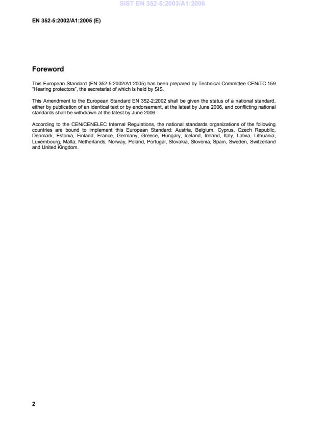 This amendment A1 modifies the European Standard EN 352-5:2002; it was approved by CEN on 3 November 2005.