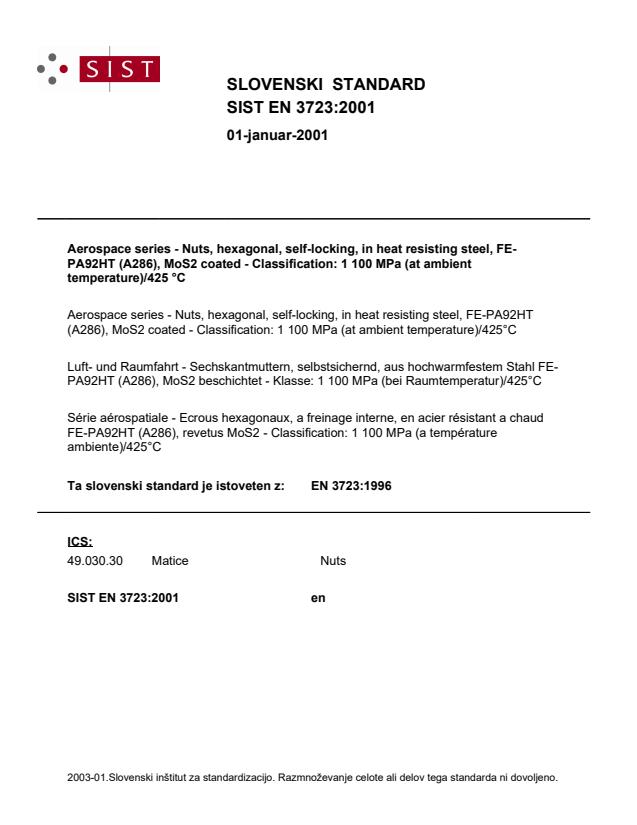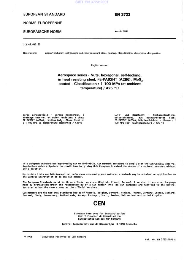 EN 3723:1996 is a standard published by the European Committee for Standardization (CEN). Its full title is "Aerospace series - Nuts, hexagonal, self-locking, in heat resisting steel, FE-PA92HT (A286), MoS2 coated - Classification: 1 100 MPa (at ambient temperature)/425°C". This standard covers: This standard specifies the characteristics of self-locking hexagonal nuts in FE-PA92HT, MoS2 coated, for aerospace applications. Classification: 1 100 MPa / 425 °C