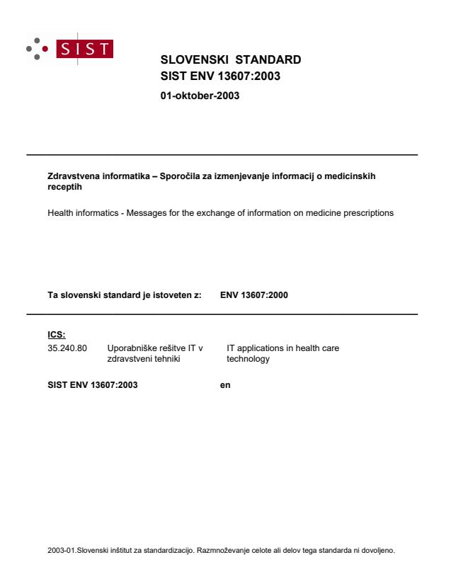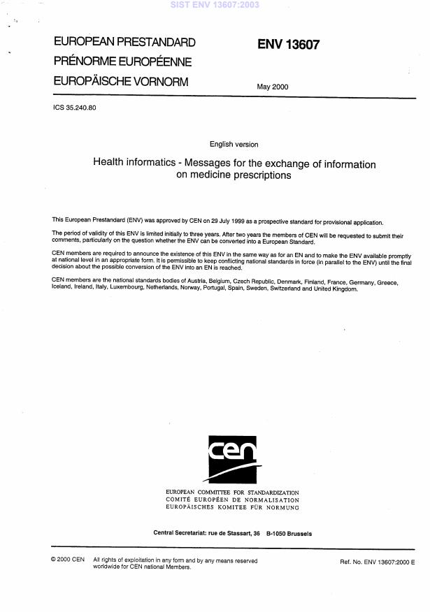 ENV 13607:2000 is a standardization document published by the European Committee for Standardization (CEN). Its full title is "Health informatics - Messages for the exchange of information on medicine prescriptions". This standard covers: 1.1. This Draft European Prestandard (prENV) specifies general messages for electronic information exchange between computer systems used by healthcare parties prescribing, dispensing or administering medicinal products/medicinal appliances. 1.2. This prENV is applicable to prescriptions for electronic information exchange issued by Healthcare Professionals (and possibly other persons) authorised by national regulations.