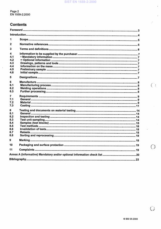 EN 1559-2:2000 is a standard published by the European Committee for Standardization (CEN). Its full title is "Founding - Technical conditions of delivery - Part 2: Additional requirements for steel castings". This standard covers: This part of EN 1559 specifies the additional technical delivery conditions for steel castings unless other conditions have been agreed at the time of enquiry and order. This standard is also applicable to nickel and cobalt alloy castings.