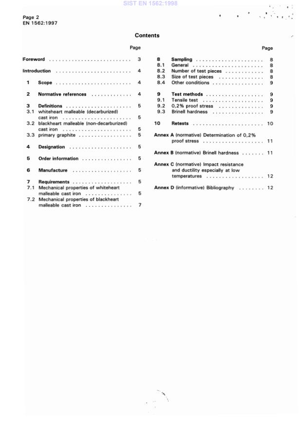 EN 1562:1997 is a standard published by the European Committee for Standardization (CEN). Its full title is "Founding - Malleable cast irons". This standard covers: This European Standard specifies requirements for malleable cast iron used in the manufacture of castings. This standard specifies two groups of material, namely whiteheart malleable cast iron and blackheart malleable cast iron. Each group is represented by several grades of material. Classification is given on the basis of mechanical properties determined on separately cast test pieces. This standard specifies 0,2% proof stress values when required by the purchaser.This standard specifies Brinell hardness values when required by the purchaser. This standard does not cover chemical composition requirements.
