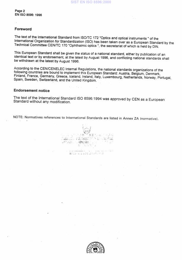 EN ISO 8596:1996 is a standard published by the European Committee for Standardization (CEN). Its full title is "Ophthalmic optics - Visual acuity testing - Standard optotype and its presentation (ISO 8596:1994)". This standard covers: Migrated from Progress Sheet (TC Comment) (2000-07-10): RG