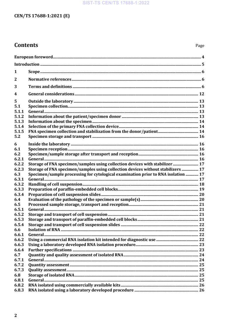 CEN/TS 17688-1:2021 is a technical specification published by the European Committee for Standardization (CEN). Its full title is "Molecular in vitro diagnostic examinations - Specifications for pre-examination processes for Fine Needle Aspirates (FNAs) - Part 1: Isolated cellular RNA". This standard covers: This document gives guidelines on the handling, documentation, storage and processing of fine needle aspirates (FNAs) intended for RNA examination during the pre-examination phase before a molecular examination is performed. This document is applicable to molecular in vitro diagnostic examination including laboratory developed tests performed by medical laboratories and molecular pathology laboratories that examine RNA isolated from FNAs. It is also intended to be used by laboratory customers, in vitro diagnostics developers and manufacturers, biobanks, institutions and commercial organisations performing biomedical research, and regulatory authorities. Different dedicated measures are taken for collecting, stabilizing, transporting and storing of core needle biopsies (FNA Biopsy or FNA B) and are not covered in this document, but in EN ISO 20184-1, Molecular in vitro diagnostic examinations - Specifications for pre-examination processes for frozen tissue - Part 1: Isolated RNA and EN ISO 20166-1, Molecular in vitro diagnostic examinations - Specifications for pre-examination processes for formalin fixed and paraffin-embedded (FFPE) tissue - Part 1: Isolated RNA. This document is not applicable for RNA examination by in situ detection. NOTE International, national or regional regulations or requirements can also apply to specific topics covered in this document.