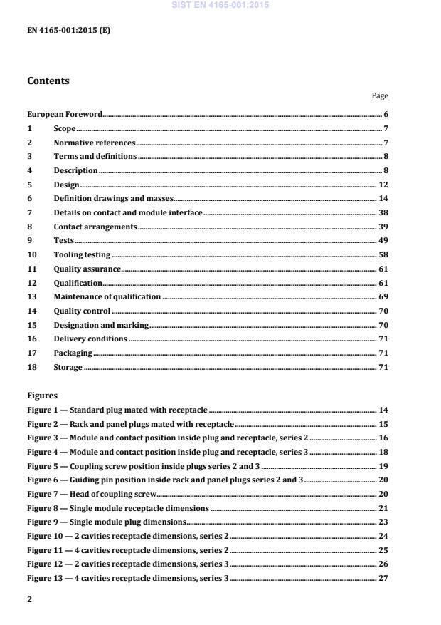 Page European Foreword . 6 1 Scope . 7 2 Normative references . 7 3 Terms and definitions . 8 4 Description . 8 5 Design . 12 6 Definition drawings and masses . 14 7 Details on contact and module interface . 38 8 Contact arrangements . 39 9 Tests . 49 10 Tooling testing . 58 11 Quality assurance . 61 12 Qualification . 61 13 Maintenance of qualification . 69 14 Quality control . 70 15 Designation and marking . 70 16 Delivery conditions . 71 17 Packaging . 71 18 Storage . 71