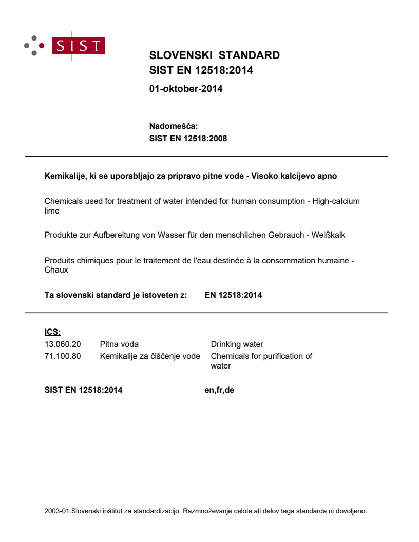 2003-01.Slovenski inštitut za standardizacijo. Razmnoževanje celote ali delov tega standarda ni dovoljeno.Kemikalije, ki se uporabljajo za pripravo pitne vode - Visoko kalcijevo apnoProdukte zur Aufbereitung von Wasser für den menschlichen Gebrauch - WeißkalkProduits chimiques pour le traitement de l'eau destinée à la consommation humaine - ChauxChemicals used for treatment of water intended for human consumption - High-calcium lime71.100.80Chemicals for purification of water13.060.20Pitna vodaDrinking waterICS:Ta slovenski standard je istoveten z:EN 12518:2014SIST EN 12518:2014en,fr,de01-oktober-2014SIST EN 12518:2014SLOVENSKI