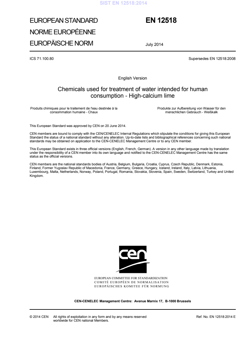 EN 12518:2014 is a standard published by the European Committee for Standardization (CEN). Its full title is "Chemicals used for treatment of water intended for human consumption - High-calcium lime". This standard covers: This European Standard is applicable to high-calcium lime used for treatment of water intended for human consumption. It describes the characteristics of high-calcium lime and specifies the requirements and the corresponding test methods for high-calcium lime. It gives information on its use in water treatment. It also determines the rules relating to safe handling and use (see Annex B).