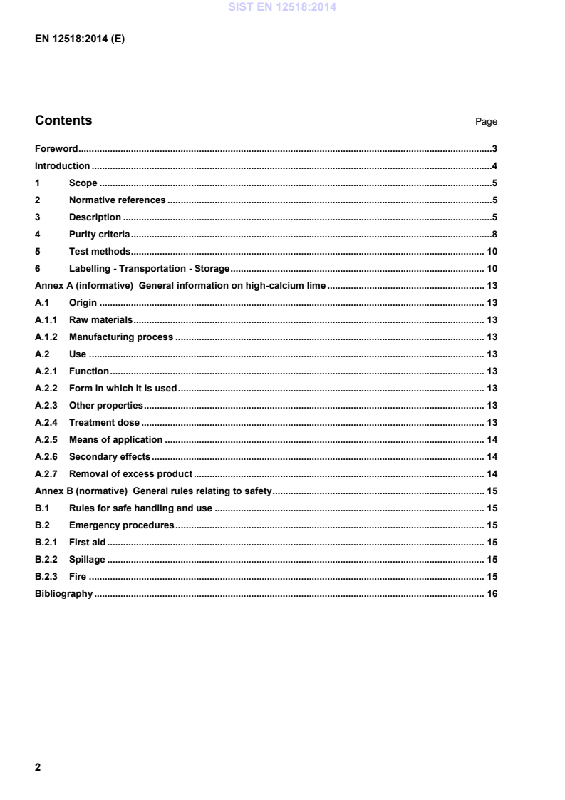 General information on high-calcium lime . 13 A.1 Origin . 13 A.1.1 Raw materials . 13 A.1.2 Manufacturing process . 13 A.2 Use . 13 A.2.1 Function . 13 A.2.2 Form in which it is used . 13 A.2.3 Other properties . 13 A.2.4 Treatment dose . 13 A.2.5 Means of application . 14 A.2.6 Secondary effects . 14 A.2.7 Removal of excess product . 14 Annex B (normative)