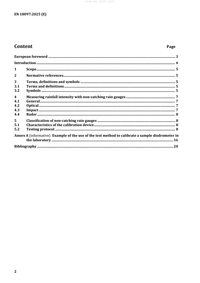 Keywords: EN 18097:2025, hydrometry, non-catching rain gauge, precipitation intensity, calibration, metrological requirements, test methods.