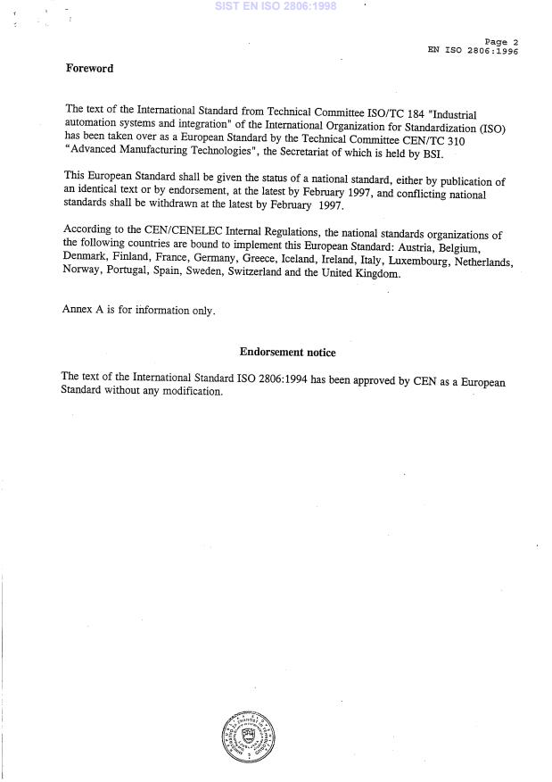 EN ISO 2806:1996 is a standard published by the European Committee for Standardization (CEN). Its full title is "Industrial automation systems - Numerical control of machines - Vocabulary (ISO 2806:1994)". This standard covers: This International Standard deals with currently used concepts relating to numerical control of maschines. It contains general terms and terms specific to the understanding of numerical control. This International Standard is intended to facilitate international communication in the numerical control of machines.