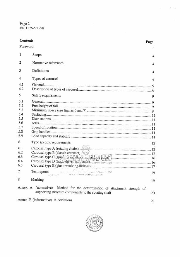EN 1176-5:1998 is a standard published by the European Committee for Standardization (CEN). Its full title is "Playground equipment - Part 5: Additional specific safety requirements and test methods for carousels". This standard covers: This Part of EN 1176 specifies additional safety requirements for carousels of diameter greater than 0,5 m intended for permanent installation for use by children. This standard is applicable to carousels that are used as playground equipment for children, as defined in 3.1. This standard is not applicable to motor-driven carousels, fairground carousels or climbing drums.