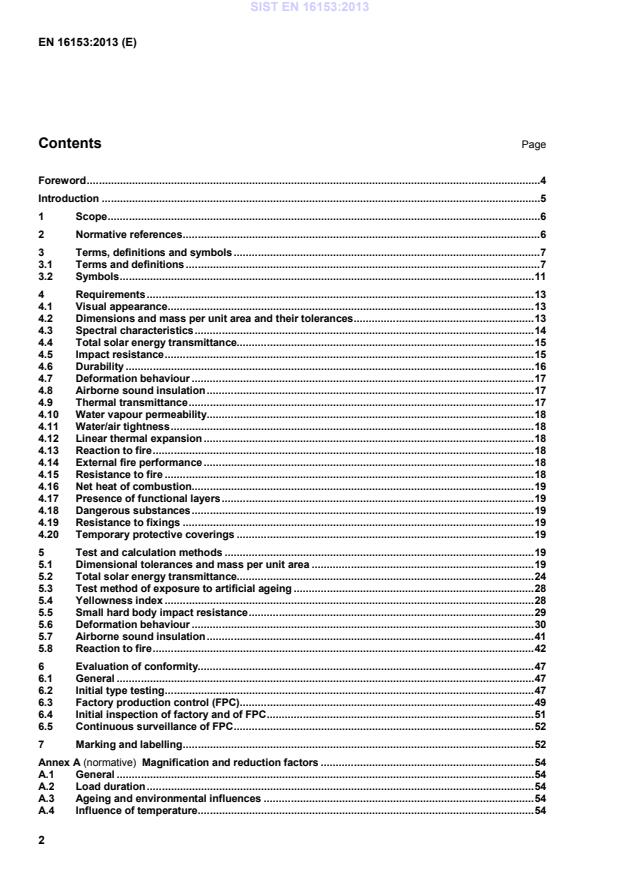 This European Standard applies to light transmitting flat extruded multiwall PC sheets with or without functional layers (e.g. coating, co-extruded layer) made from PC-based or other materials, without filling materials. It also specifies the test methods needed for the evaluation of conformity and marking of the sheets. 2 Normative references The following documents, in whole or in part, are normatively referenced in this document and are indispensable for its application. For dated references, only the edition cited applies. For undated references, the latest edition of the referenced document (including any amendments) applies. EN 410:2011, Glass in building — Determination of luminous and solar characteristics of glazing EN 673, Glass in building — Determination of thermal transmittance (U value) — Calculation method EN 674, Glass in building — Determination of thermal transmittance (U value) — Guarded hot plate method EN 1990:2002, Eurocode — Basis of structural design EN 1873:2005, Prefabricated accessories for roofing — Individual roof lights of plastics — Product specification and test methods EN 1995-1-1, Eurocode 5: Design of timber structures — Part 1-1: General — Common rules and rules for buildings EN 13501-1, Fire classification of construction products and building elements — Part 1: Classification using data from reaction to fire tests EN 13501-2, Fire classification of construction products and building elements — Part 2: Classification using data from fire resistance tests, excluding ventilation services EN 13501-5, Fire classification of construction products and building elements — Part 5: Classification using data from external fire exposure to roofs tests EN 13823, Reaction to fire tests for building products — Building products excluding floorings exposed to the thermal attack by a single burning item EN 14500:2008, Blinds and shutters — Thermal and visual comfort — Test and calculation methods EN 14963:2006, Roof coverings — Continuous rooflights of plastics with or without upstands — Classification, requirements and test methods EN ISO 178, Plastics — Determination of flexural properties (ISO 178) EN ISO 291, Plastics — Standard atmospheres for conditioning and testing (ISO 291) EN ISO 472:2013, Plastics — Vocabulary (ISO 472:2013) EN ISO 717-1, Acoustics — Rating of sound insulation in buildings and of building elements — Part 1: Airborne sound insulation (ISO 717-1) SIST EN 16153:2013