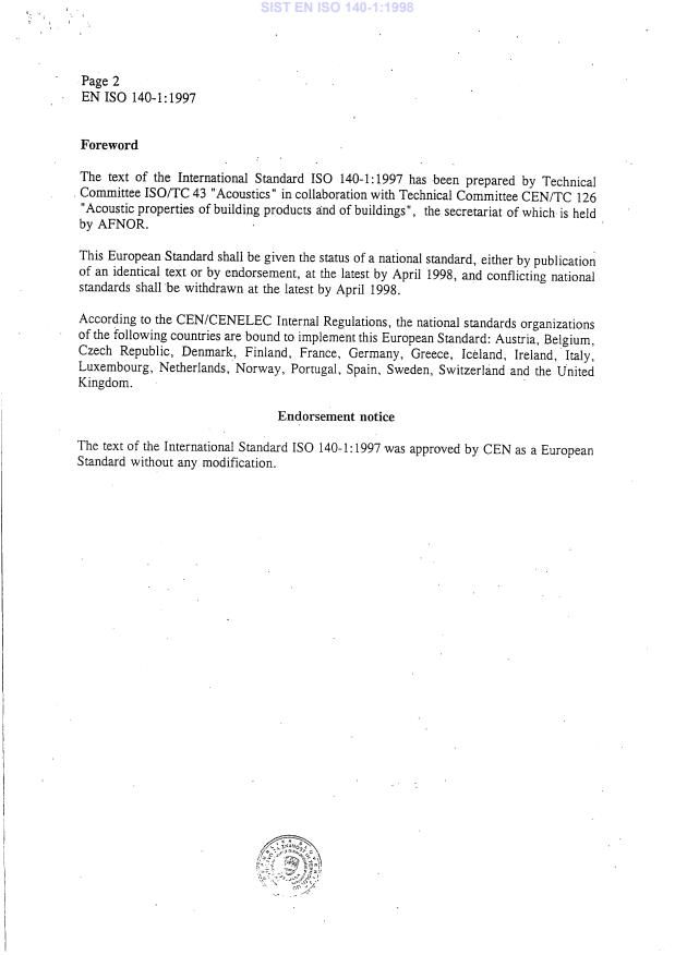 EN ISO 140-1:1997 is a standard published by the European Committee for Standardization (CEN). Its full title is "Acoustics - Measurement of sound insulation in buildings and of building elements - Part 1: Requirements for laboratory test facilities with suppressed flanking transmission (ISO 140-1:1997)". This standard covers: Migrated from Progress Sheet (TC Comment) (2000-07-10): EN ISO 140-1 and -3 to -8 are a package and have as DOW 1997-06-30 (BTS1 17/94) ++ DOW for EN ISO 140-1, -3 to -8 will be 1998-12-31 (2nd ext. - BTS1 C 16/1997)