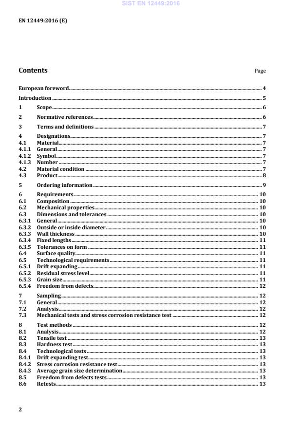 — fixed length 3 000 mm 6 Requirements 6.1 Composition The composition shall conform to the requirements for the appropriate material given in Tables 1 to 8. 6.2 Mechanical properties The properties shall conform to the appropriate requirements given in Tables 9 to 15. The tests shall be carried out in accordance with either 8.2 (tensile test) or 8.3 (hardness test). Products in stress relieved condition shall conform to the same mechanical property requirements as for non stress relieved material. 6.3 Dimensions and tolerances 6.3.1 General The geometrical properties of the tubes are defined by outside diameter or inside diameter, wall thickness and length. Normally, tolerances for cross-sectional dimensions are applied on the outside diameter (see 6.3.2) and wall thickness (see 6.3.3) but other possibilities may be agreed between the purchaser and the supplier at the time of the enquiry and order [see Clause 5, list entry j)]. Normally, tubes are supplied in lengths with tolerances agreed between the purchaser and the supplier at the time of the enquiry and order [see Clause 5, list entry g)] but tubes may be ordered as "fixed lengths" (see 6.3.4). 6.3.2 Outside or inside diameter The diameter of the tubes shall conform to the tolerances given in Table 17. 6.3.3 Wall thickness The wall thickness, measured at any point, shall conform to the tolerances given in Table 18. SIST EN 12449:2016