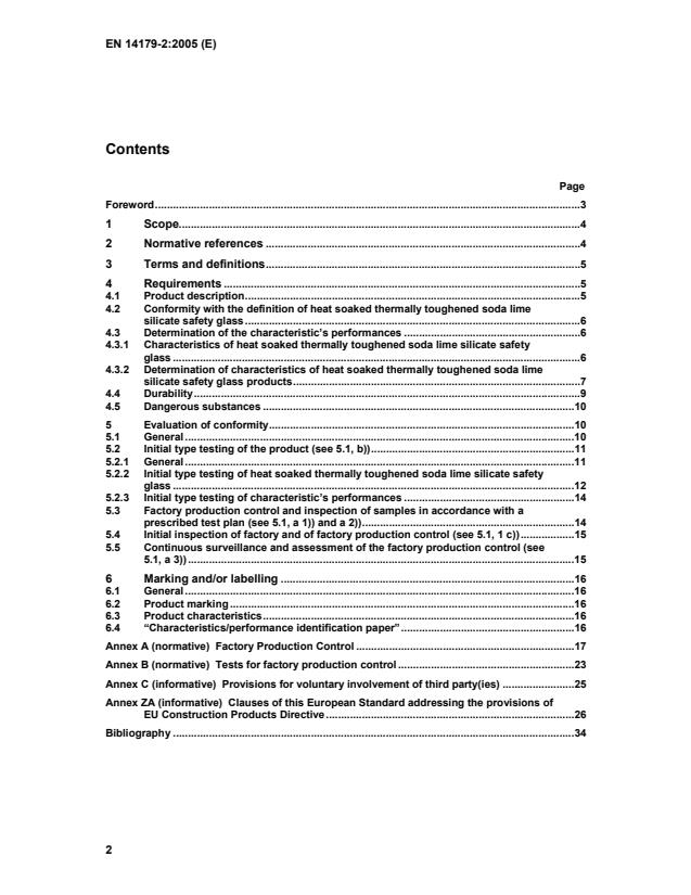 EN 14179-2:2005 is a standard published by the European Committee for Standardization (CEN). Its full title is "Glass in building - Heat soaked thermally toughened soda lime silicate safety glass - Part 2: Evaluation of conformity/Product standard". This standard covers: This document specifies requirements, the evaluation of conformity and the factory production control of flat heat soaked thermally toughened soda lime silicate safety glass for use in buildings. NOTE For glass products with electrical wiring or connections for, e.g. alarm or heating purposes, other directives, e.g. Low Voltage Directive, may apply.