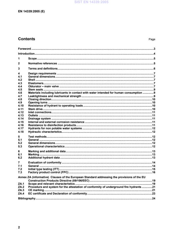 EN 14339:2005 - Underground fire hydrants (CEN) is the European standard that specifies requirements, test methods and marking for underground fire hydrants intended for fire-fighting use. It covers hydrants installed in water distribution systems in sizes DN 80 and DN 100, designed for allowable operating pressures (PFA) of 10 bar, 16 bar or 25 bar, with or without a drain facility. The standard applies to hydrants for potable, non‑potable and filtered water and provides rules for conformity assessment and related CE/Declaration of Conformity procedures.