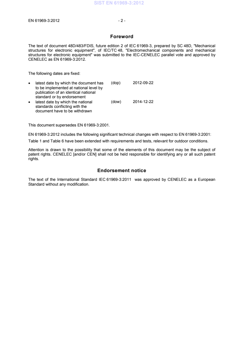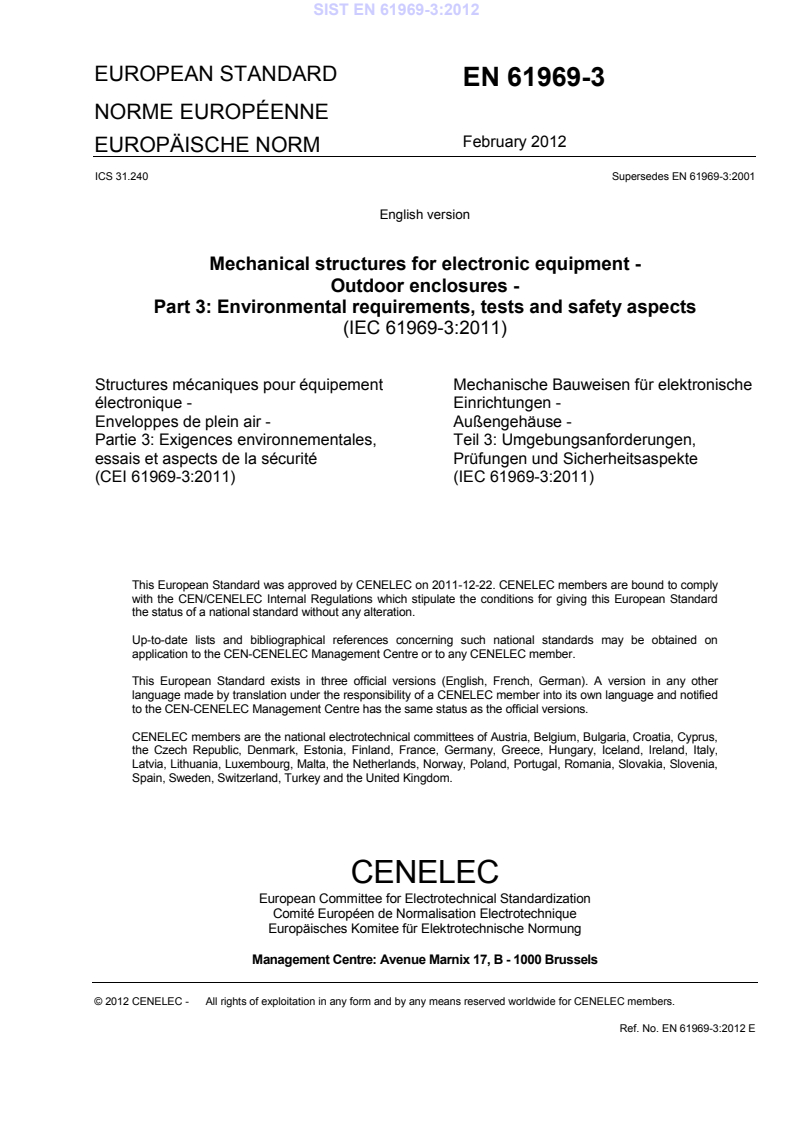 EN 61969-3:2012 is a standard published by CLC. Its full title is "Mechanical structures for electronic equipment - Outdoor enclosures - Part 3: Environmental requirements, tests and safety aspects". This standard covers: IEC 61969-3:2011 specifies a set of basic environmental requirements and tests, as well as safety aspects for outdoor enclosures under conditions of non-weatherprotected locations above ground. The purpose of this standard is to define a minimum level of environmental performance in order to meet requirements of storage, transport and final installation. It is the intention to establish basic environmental performance criteria for outdoor enclosure compliance. This second edition cancels and replaces the first edition issued in 2001. It constitutes a technical revision. The main technical changes with regard to the previous edition are as follows. Table 1 and Table 6 have been extended with requirements and tests, relevant for outdoor conditions.