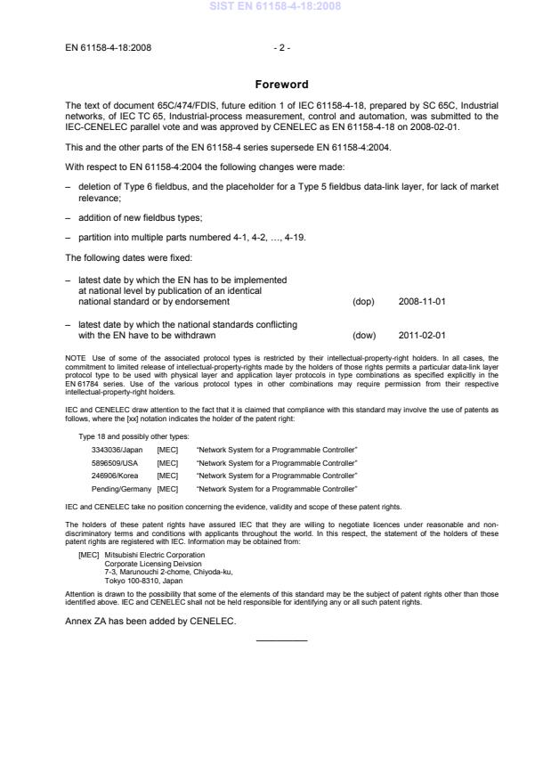 Tokyo 100-8310, Japan Attention is drawn to the possibility that some of the elements of this standard may be the subject of patent rights other than those identified above. IEC and CENELEC shall not be held responsible for identifying any or all such patent rights. Annex ZA has been added by CENELEC. __________ SIST EN 61158-4-18:2008